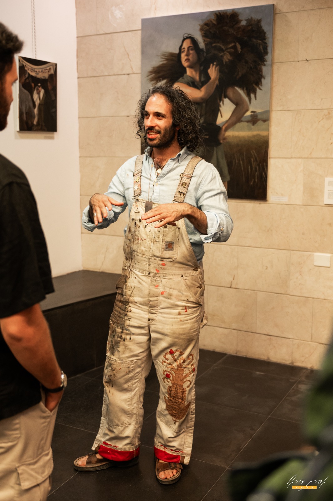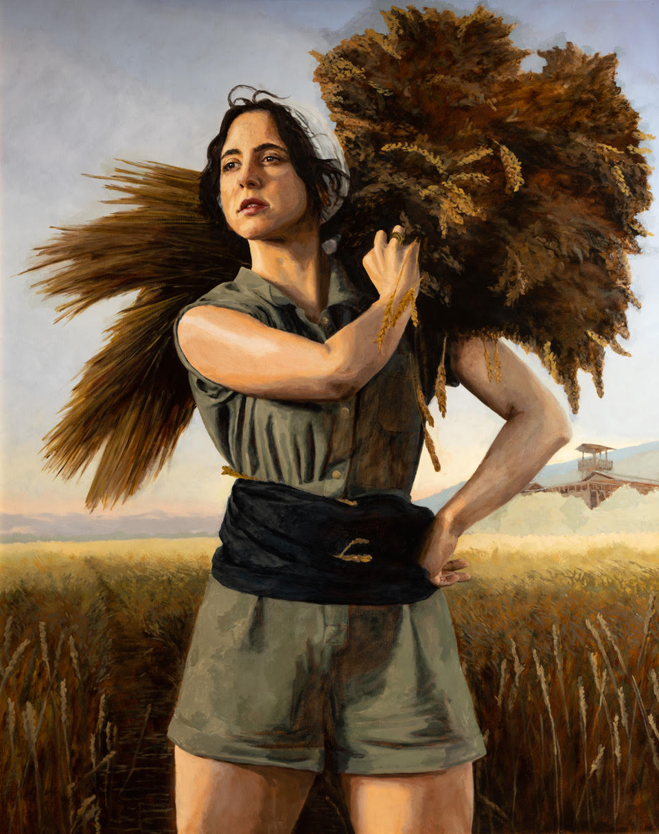 Artist Avraham Vofsi captures the wedding of two close friends choosing to get married during wartime, as well as this very commanding kibbutz woman hauling a bale of wheat on her shoulder, “reminiscent of the powerful figure of Ruth,” from the Biblical story we read on Shavuot. Inbal Singer chose to see the great acts of bravery that have taken place during the war, and in particular, she highlights “the important contributions of some impressive women,” including Rachel Goldberg-Polin (mother of hostage Hersh), Noa Tishbi (media influencer), Rachel Edri (the rescued hostage from Ofakim), Anya Knafo (ambulance driver who rescued many on October 7th), Dr. Debra West (head of emergency at Assuta Hospital who worked non-stop for days), and many others.