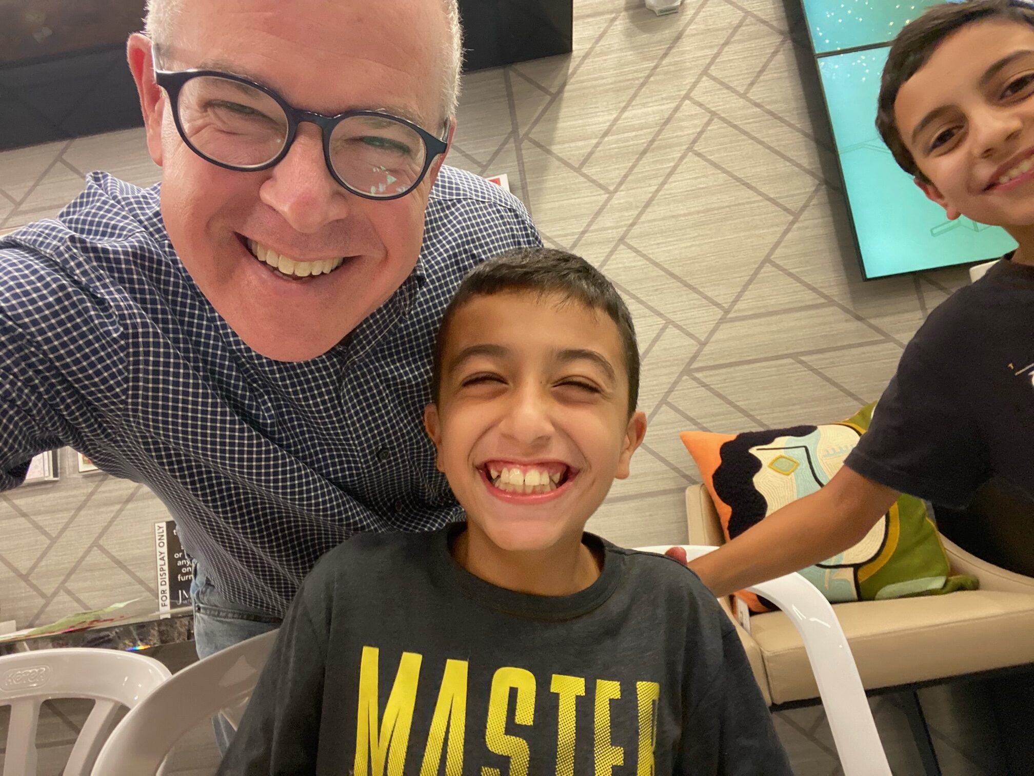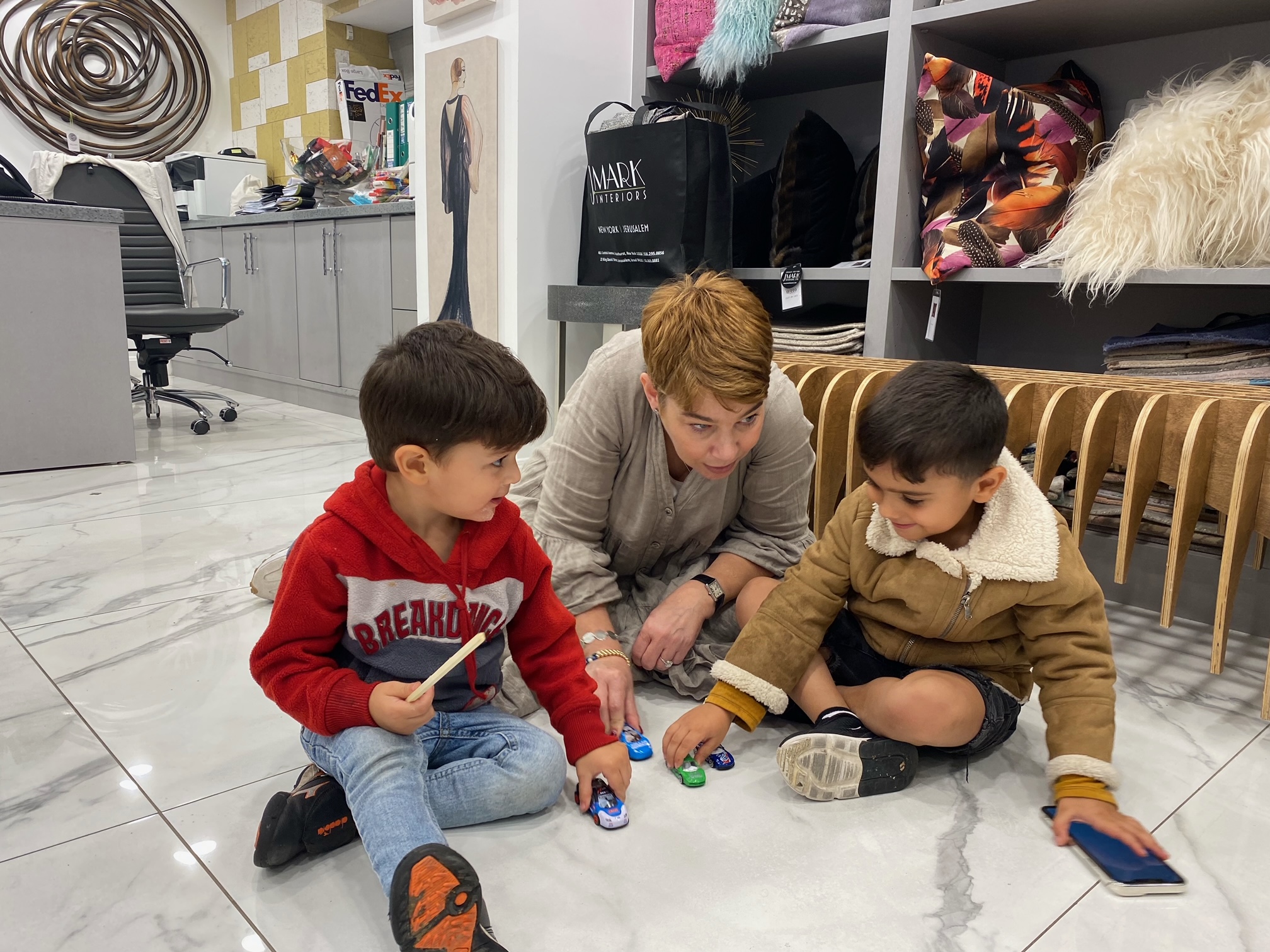 Right next to the hotel is the showroom of J. Mark Interiors, a NY and Jerusalem-based architecture and design firm owned by my good friend, Jeffrey Mark. Since I was there anyway, I went to visit. Jeffrey asked my help coming up with a project that he and his staff could get behind to be part of the war effort, rather than just sitting around worrying. I told him about his new neighbors in the hotel. I told him that we needed to pay for meals for the families, especially on Shabbat, the Sabbath. I told him that this one-week respite that’s been paid for was not enough and that we needed to raise funds for at least 2-3 more weeks, probably bringing more people. I suggested that we needed activities for the kids to engage them, and give the parents some time alone.