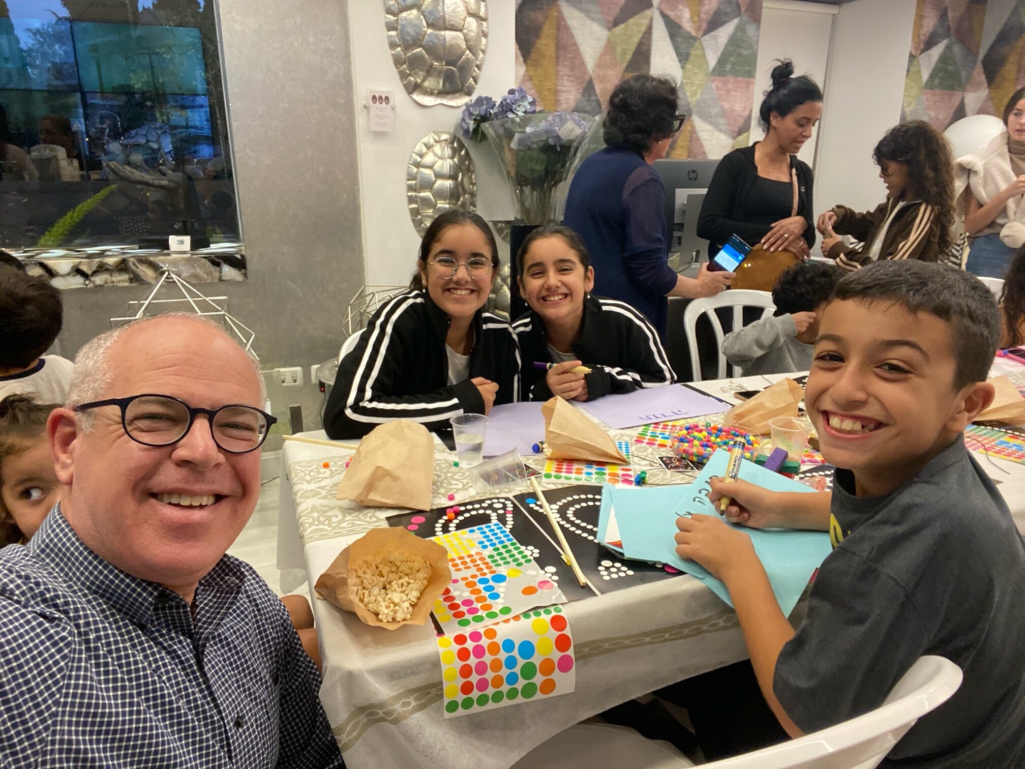 Arts and crafts and movies for the kids. Pizza and popcorn. Felafel and cotton candy. Singing and smiling. Volunteers stepped up in a way that still astounds me including all of Jeffrey’s staff, family and friends, and Ruth and Francis, Christian friends I had only met only yesterday on a webinar briefing I hosted at 4:00am and who happened to be visiting, and my own children. Everyone wanted to do something to help.