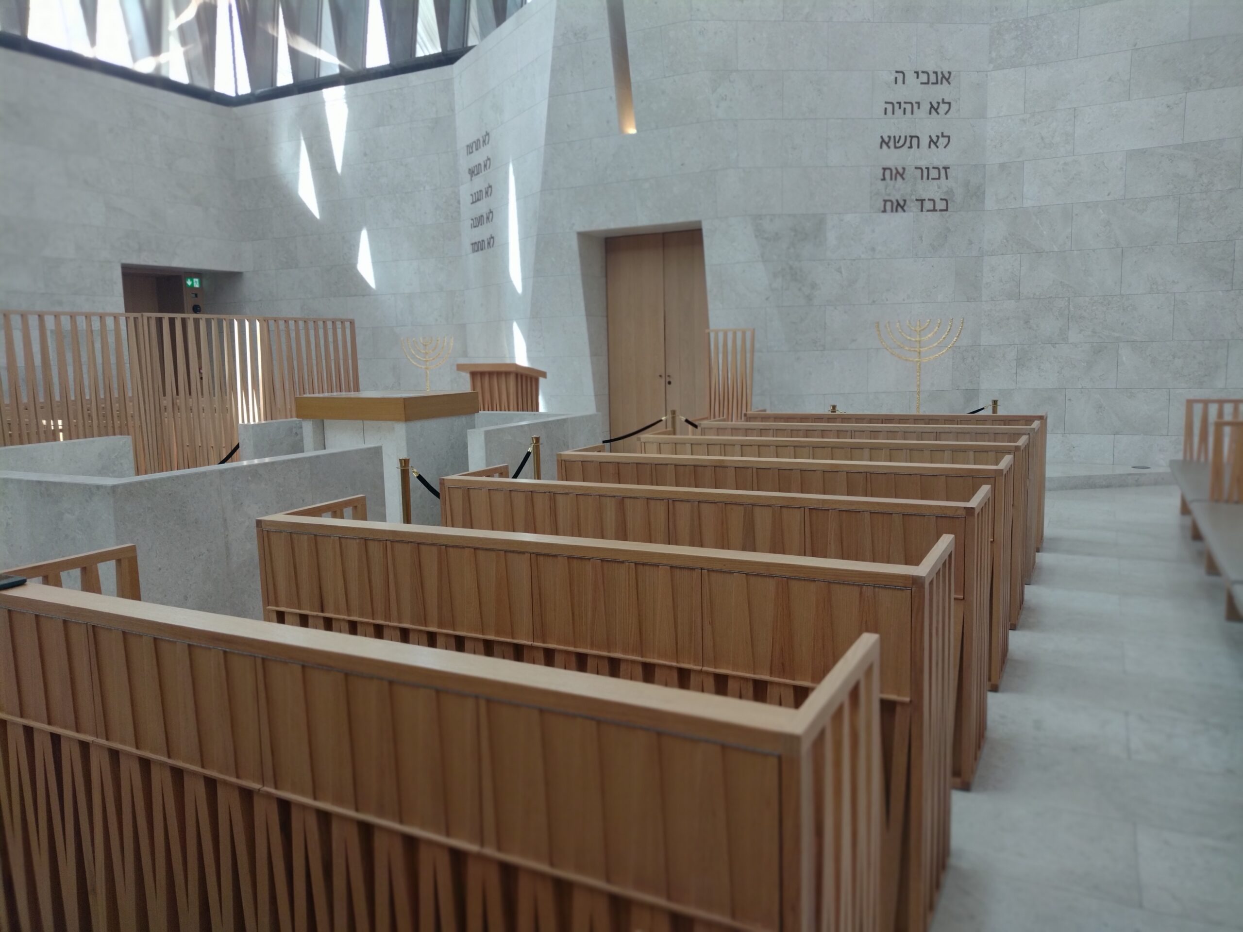 Our daughter drove us to Abu Dhabi to see the beautifully designed Abrahamic Center, which has a church, mosque, and synagogue standing side by side. We had a guide who explained the architectural similarities and differences. The women were given a scarf to cover their hair in the Mosque and we had been warned previously that women had to wear long skirts to cover their ankles. We saw photos of the 2019 ceremony when Pope Francis and the Emiratis signed a “Foundation Stone” to promote relations between the three Abrahamic faiths, but there was no Jewish representative. Various excuses were given – e.g. no Jewish leader could be found; it was the Pope’s visit and they didn’t want to confuse it by including a Jew! After the tour we happened to meet the Rabbi (Jeff Berger) who appealed for us to come and stay for Shabbat – they have a Shabbat service but only sometimes get a minyan. The Emirate pays for the kosher catering for festival meals, participants are not allowed to donate. Our daughter went there for Succot and said it was great.