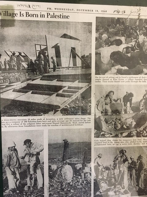 After our pleasant visit with Ari at Arugot Farms, which is the eco resort, spiritual retreat, and farm being built by The Land of Israel (thelandofisrael.com) ,we had to hurry to get to the Gush Etzion Heritage Center in time for the scheduled English language tour. The museum’s layout is a now-familiar one in Israel, in which a group is ushered through several rooms to watch a sound and light presentation and see artifacts from particular periods. Here, we found ourselves in a network of halls and passageways around the bunker where Kfar Etzion’s last defenders fell. The historical background:
