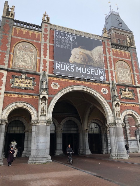 pics by Steve: view of Herengracht Canal from our hotel room; ubiquitous bicycles (no helmets on riders!); the tram line to Hell; former theater turned orphanage, now a museum; Steve in ten Boom hiding place, accessible through an attic room closet; a commercial building in Haarlem; Rijks Museum