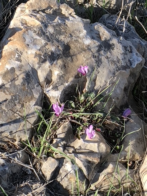 Our hike began on the eastern side of the valley at an elevation of 330 feet, between Mt. Tabor and Ein Dor, the location where King Saul famously consulted a witch about his upcoming, fatal battle. We descended several hundred feet (eventually to below sea level), picking our way through the rocky terrain to a pretty flat trail that constituted much of the hike. All along the way, the views were spectacular, including clusters of winter flowers, especially bright red/purple rakefot (cyclamen). The Jezreel Valley is known for its many springs, though just one hundred years ago much of it was swampland which the Jewish pioneers drained.