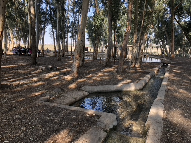 We hiked on in this beautiful landscape until we came to the Ein Yisrael park, where the eponymous stream is located. The spring emanates from a tunnel system hewn into the layer of rock holding the water. The tunnels were created to increase the flow of spring water. Historically, King Saul camped here before his last and fatal battle. We were very happy to use the picnic tables provided for our lunch. As we left, we were serenaded by a young woman who graciously interrupted her picnic to entertain us with her voice and guitar.
