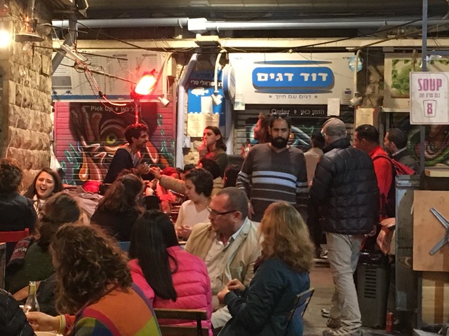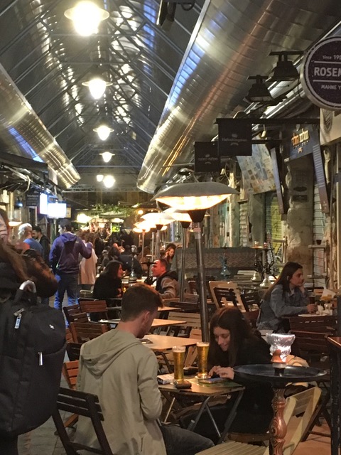 For dinner, we joined two of Moshe’s friends for an excellent fish dinner in the famous Machane Yehuda market. This covered shuk is busy during the day with local shoppers and tourists enjoying the many restaurants, bars, fruit/vegetable stands, and innumerable stalls selling nuts, dried fruit, spices and more. At night, numerous tables and chairs are set out to serve the diners and bar patrons who populate the shuk.