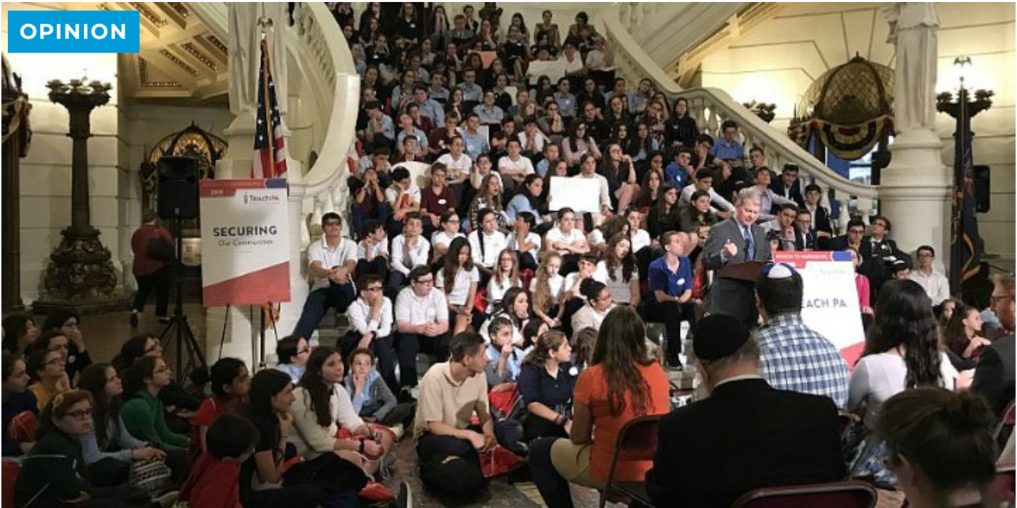 Illustrative: Pennsylvania State Sen. David Argall addressed the more than 300 Jewish-day school students, parents and administrators gathered at the State Capitol in Harrisburg. Photo: Teach PA.