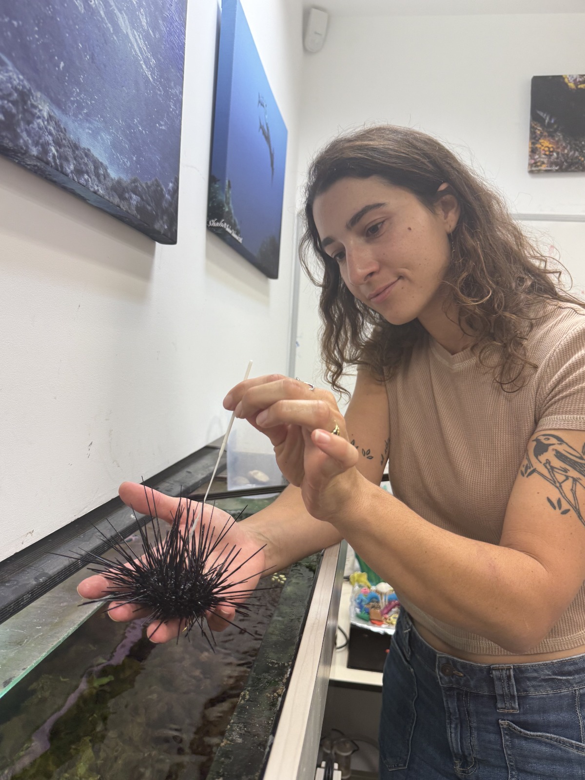 - Mai Bonomo holding sea urchin & swabbing it. Photo credit: Tel Aviv University.
